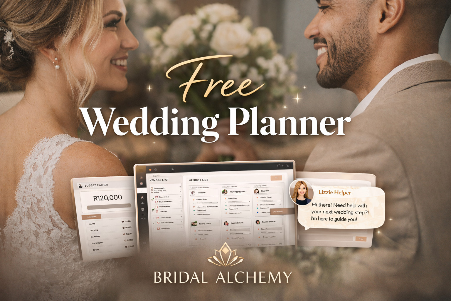 A powerful free wedding planner built for real couples: budget tracking, vendor shortlists, planning guidance, and the Lizzie Helper to keep you moving.