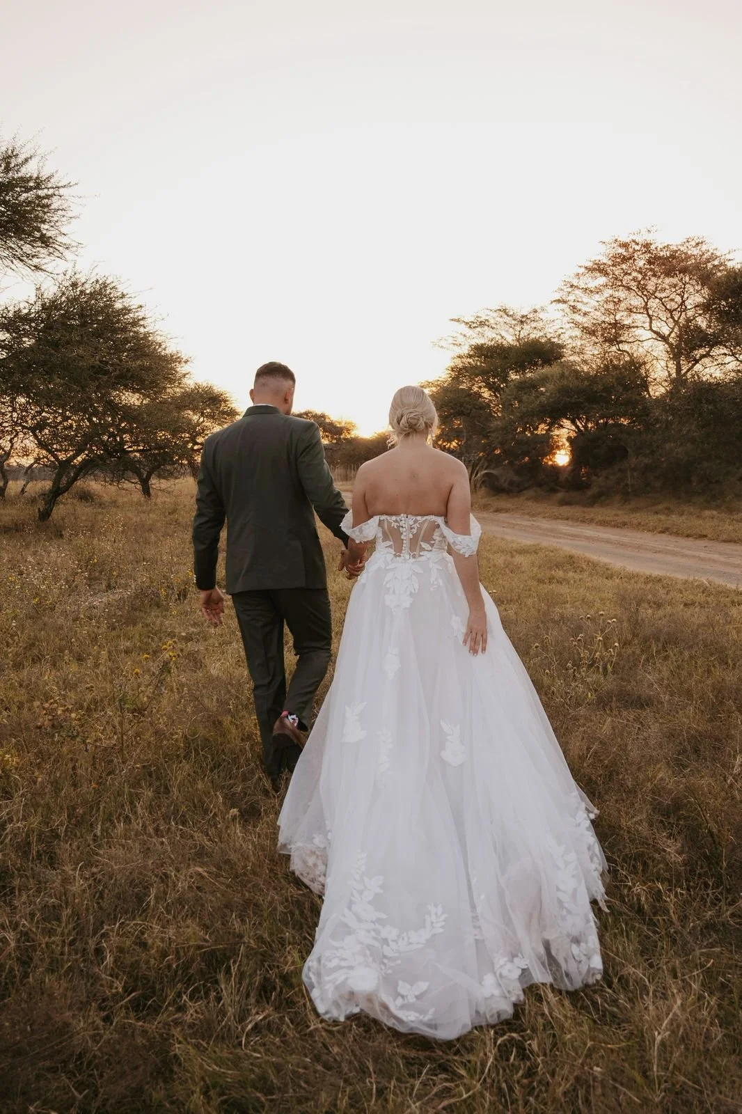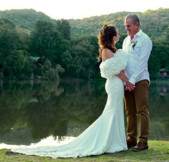 A lace-sleeved wedding gown combining modern structure with classic detailing. The balance of fitted bodice and soft skirt gave Charné’s look a timeless charm.