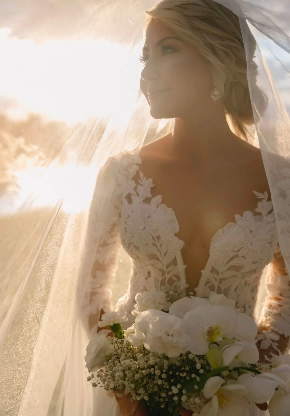 A custom-designed gown featuring 3D floral lace and soft tulle bow sleeves. This playful yet sophisticated creation highlighted our passion for couture bridal artistry.